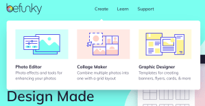 BeFunky seria una segona opció que difereix lleugerament de Canva per estar format per un conjunt d’eines gratuïtes d’edició d’imatges on podreu accedir des del vostre navegador web: un editor de fotos, un fabricant de collage i un dissenyador