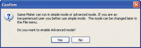 El primer cop que executes el programa Game Maker 7 et preguntarà, en llengua anglesa, si vols fer-ho de manera simplificada o avançada, si no has utilitzat aquest programa anteriorment o els coneixements en programació són molt generals et recomanem, de totes totes, que utilitzis el mode simple seleccionant No; doncs en aquest es mostren molt poques opcions i sempre pots migrar al superior des del menú arxiu del propi entorn (el programari oficial de l’autor, els exemples publicats a la xarxa, les especificacions i demés estan escrites i descrites en anglès. Cal apuntar què la versió 7 és del 2007 i que des del 2010 diferents comunitats de programadors indies han modificat la versió 8 amb forces novetats i la mateixa base)