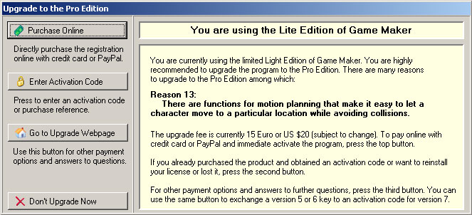 El registre és el següent quadre que el Game Maker et proporciona. En aquest us indica, de manera amable, que podeu fer un registre en línia, entrar un codi d’activació vàlid, veure les condicions de pagament a la pròpia web o no registrar. Per començar us recomanem que no registreu el programa perquè funciona íntegrament i les opcions més significatives estan disponibles tot prement Don’t Upgrade Now. Per contra, l’única cosa que no podreu fer és utilitzar unes atribucions avançades del entorn; llibreries d’accions que us mostraran l’etiqueta PRO i que significa que l’accés és restringit (també tindreu que suportar que una publicitat de la pàgina de l’autor us aparegui cada cop que llanceu un joc compilat amb l’eina o l’executeu des del programari). A favor seu hem de dir que el registre val la pena: obre i actualitza totes les opcions del programa, ofereix accessos a la comunitat de programadors, enllaça amb la pròpia web permetent publicacions directes, es fa via PayPal i només ens costa 15 Euros (a tots aquells que estiguin contemplant altres opcions com, por exemple, compartir llicències a vàries màquines assenyalar que no és possible doncs el programa identifica màquina i usuari. Ara toca recordar que la pirateria és un delicte, que hi ha gent vivint de tot això i que, de ben segur, ens dirien a cau d’orella allò de: espero que demà us quedeu sense feina o no la trobeu!)