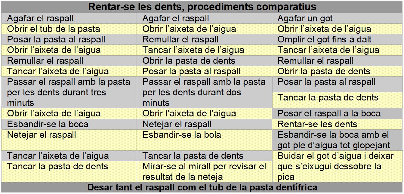 Després de veure l’anterior quadre quina de les tres opcions us sembla més adequada i quina menys (mireu de raonar la resposta oferint aportacions que us afegeixin cert valor i recordant que cada procés està format per 12 instàncies que corresponen a cadascuna de les cel.les; sent la que fa 13 comú als tres). Tanmateix, us sembla que hi hauria alguna possibilitat de millora prenent-ne qualsevol com a mostra i complementant-la amb aquelles instruccions que hi falten?, com ho definiríeu?, l’ordre “passar el raspall amb la pasta per les dents” podria ser una nova seqüència d’indicacions?, penseu-hi!