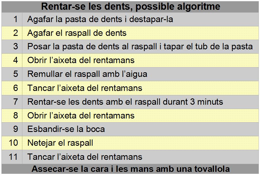 Acabem de donar una idea del que en matemàtiques i, per extensió, a informàtica s’anomena algoritme (sèrie ordenada d’instruccions, passos o activitats que ens porten a la solució d’un determinat problema, aquí, rentar-se les dents)