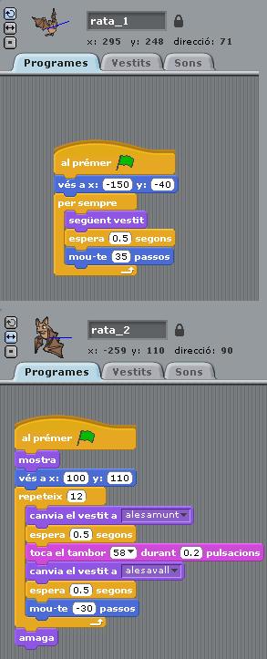 A la dreta us oferim una imatge amb dues captures de pantalla que mostren la programació inicial de dos dels actors que intervenen a la nostra tutoria; observeu-les amb deteniment per comprovar de quina manera s’ha definit el moviment o el canvi de vestit de cadascun, conceptes inicials i bàsics de qualsevol videojoc