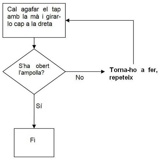 Un tercer. El problema que aquí plantegem serà destapar una ampolla d’aigua amb tap de rosca. Si hi penseu, ràpidament veureu que una de les instruccions, ordres o indicacions hauran de ser la mateixa repetida, no? Mirem aquest diagrama