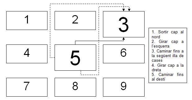 Anem a veure un altre exemple. Ens trobem al quadre central d’aquests nou que volen significar un plànol i ens pregunten com anar, pel carrer, al marcat com a número 3. Si veiem la imatge podrem trobar més d’una solució per anar-hi, aquí, més d’un camí que haurem de fer seguint unes indicacions o instruccions ordenades començant per fer la primera acció i després la immediatament següent fins a arribar a la destinació. Aquestes, les podrem representar a una llista, a una taula com en el exemple anterior del raspall (rentar-se les dents) o bé amb un dibuix anomenat diagrama i poden ser tant extenses com vulguem sempre que aconseguim el resultat o bé solució que cerquem o indiquem. Haurem de veure però que el millor, per ràpid i òptim, sempre serà el més curt